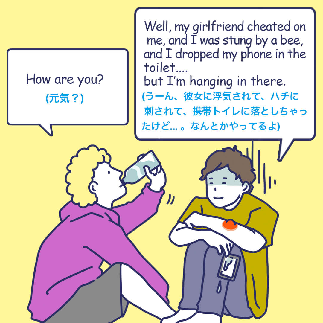 日本語同様、さり気なく使うこともあれば、例文のように本当に大変なことが起きているけれど「なんとかやっている」という状況でも使います。
