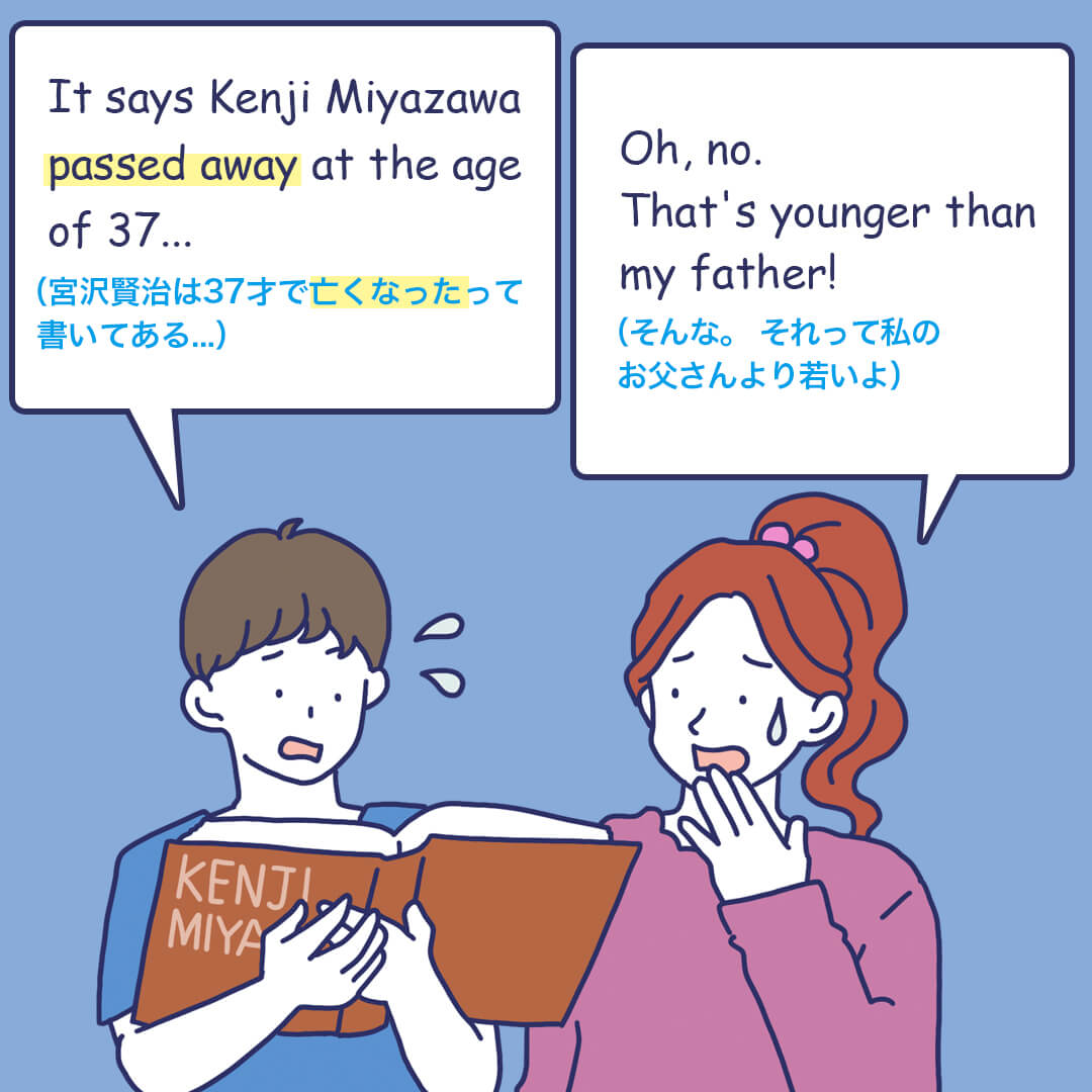 冠婚葬祭 Contents日常/冠婚葬祭「亡くなった」英語でなんて言う?「今年は寅年」英語でなんて言う? 日常/冠婚葬祭 「亡くなった」英語でなんて言う? 会話① http://gakuenn.3min-eikaiwa.com/wp-content/uploads/2023/04/o619_1.wav 会話② http://gakuenn.3min-eikaiwa.com/wp-content/uploads/2023/04/o619_2.wav Point 日本語でも「死んだ」よりも「亡くなった」を使う方が丁寧ですよね。 同様に、diedよりもpassed awayの方が丁寧な言い方です。 「今年は寅年」英語でなんて言う? 会話① http://gakuenn.3min-eikaiwa.com/wp-content/uploads/2023/04/o903_1.wav 会話② http://gakuenn.3min-eikaiwa.com/wp-content/uploads/2023/04/o903_2.wav Point 「十二支」はthe twelve zodiac signs in Chinese astrologyなどと言います。