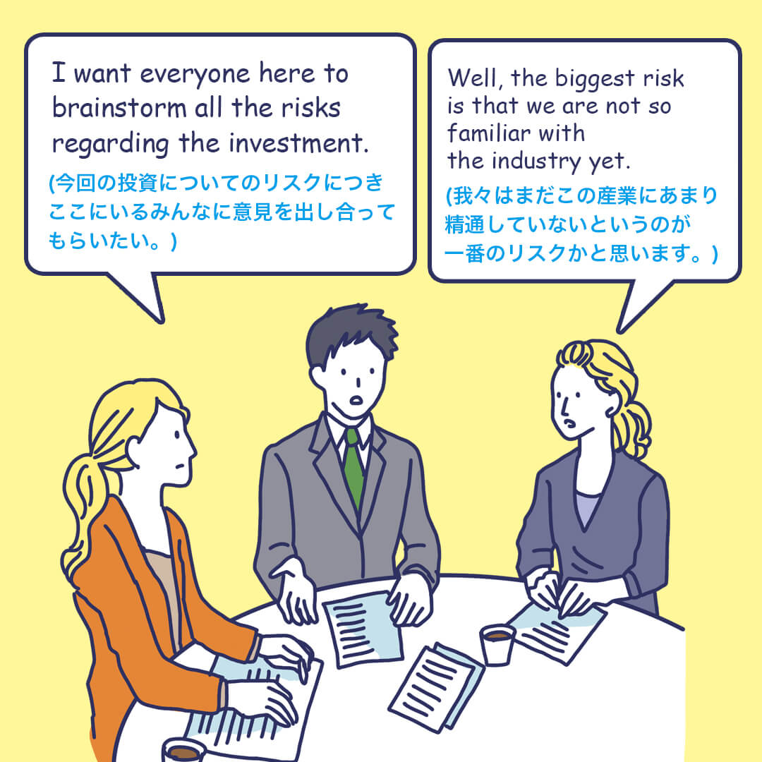 「今回の投資についてのリスクにつきここにいるみんなに意見を出し合ってもらいたい」英語でなんて言う?