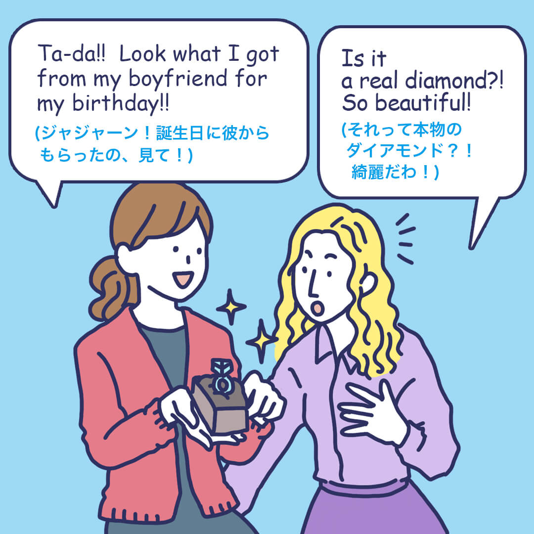 「ジャジャーン!」は’Ta-da!!’です。日本語とは全然違っておもしろいですよね。