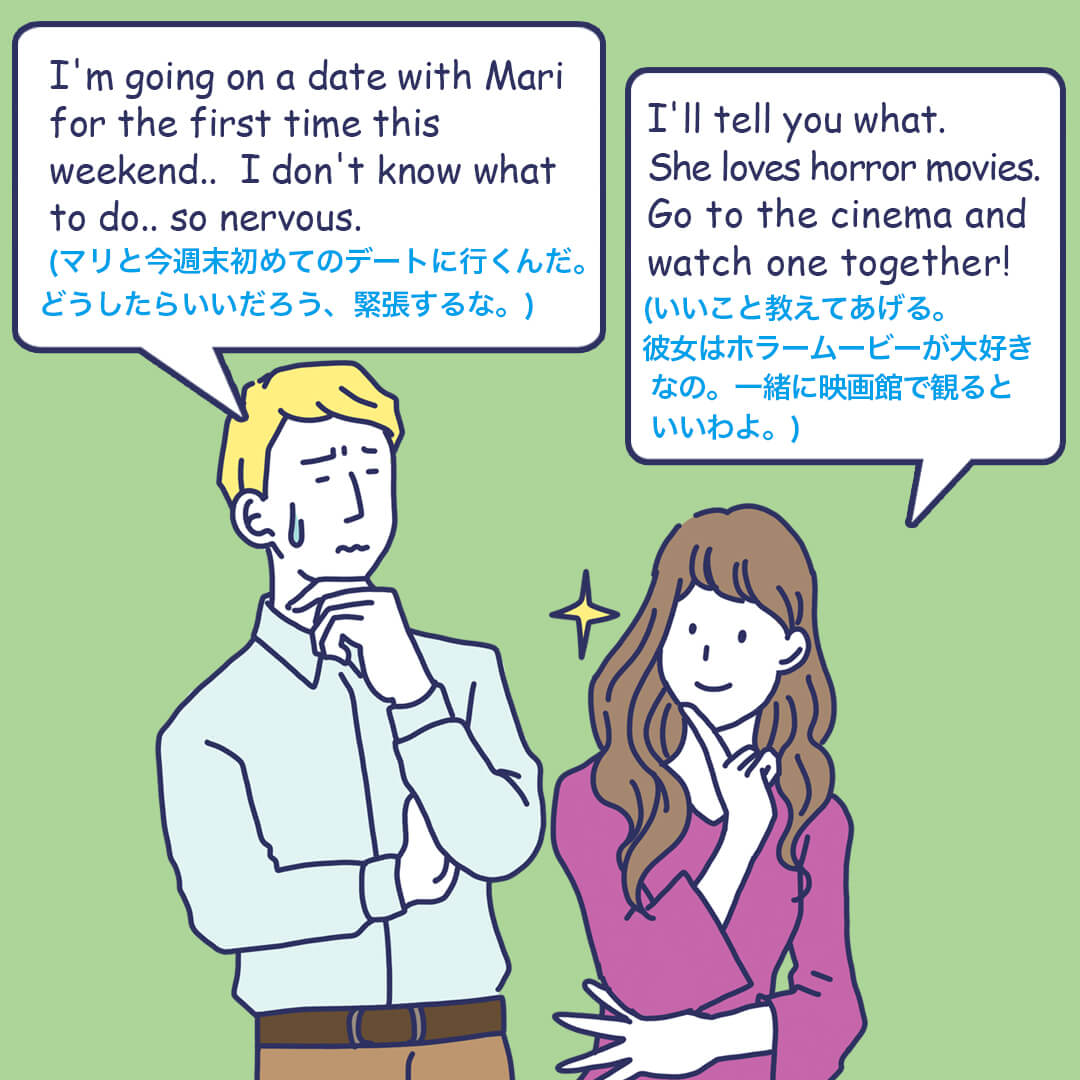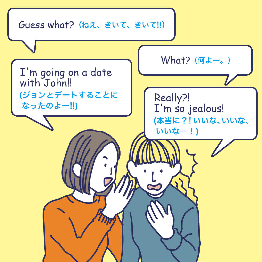 guess what?(ねえ、きいて、きいて♪) は真剣に話しを聞いてほしい時ではなく、何か嬉しいことを報告するときの話し始めに使われるカジュアルなフレーズです。「デートする」はgo on a date と言います。