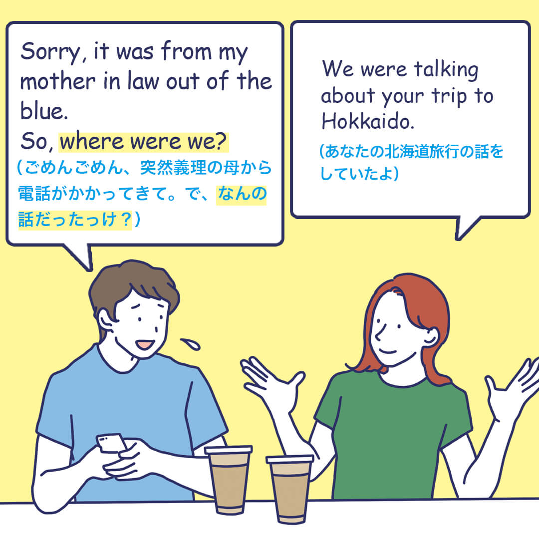 Where were we?(私たちどこにいたんだっけ?)という英語らしい表現です。