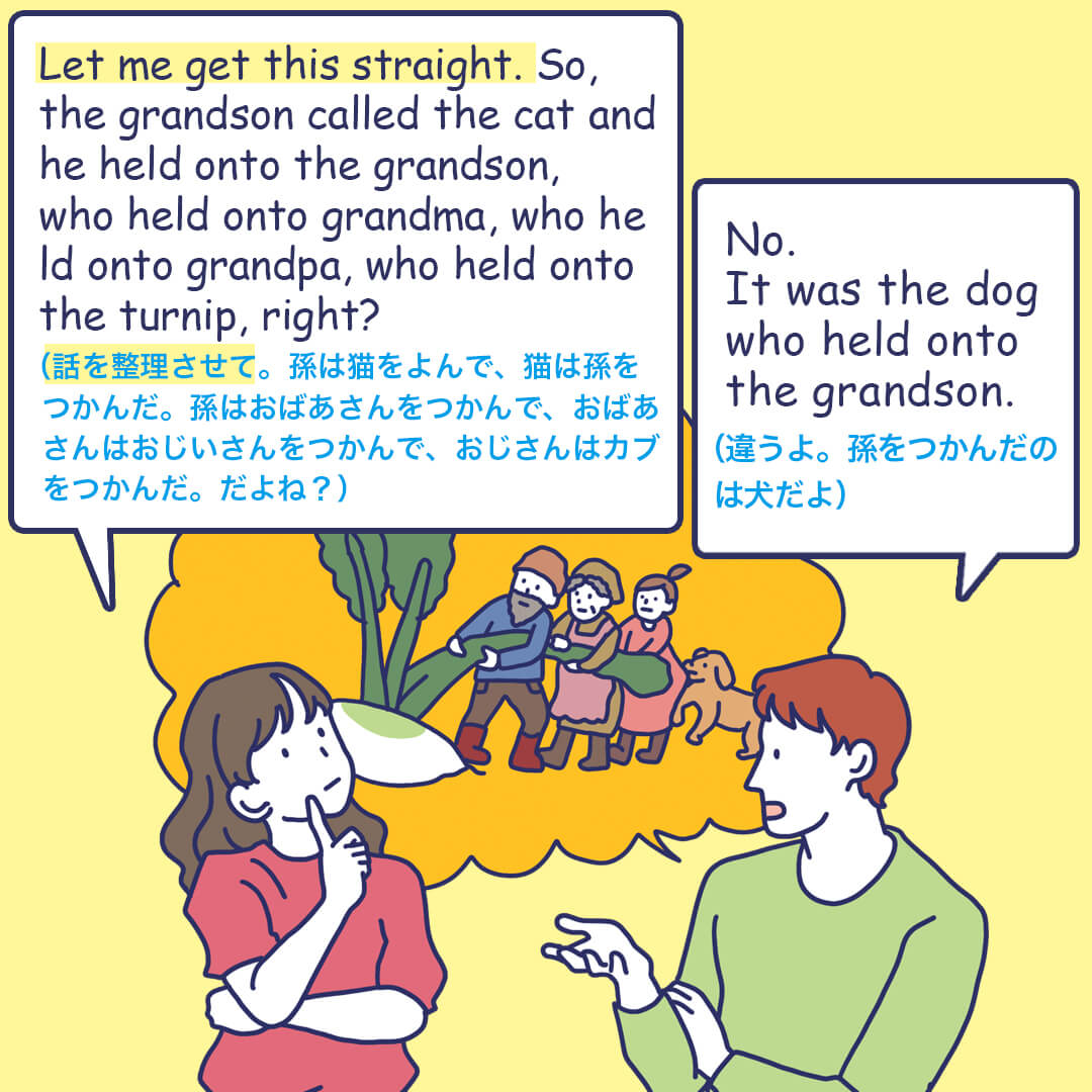 話が混乱してきた時に、「ちょっと話を整理させてね」という意味で使うフレーズです。straightには「真っ直ぐな」という意味のほかに「きちんとした/整然とした」という意味があります。