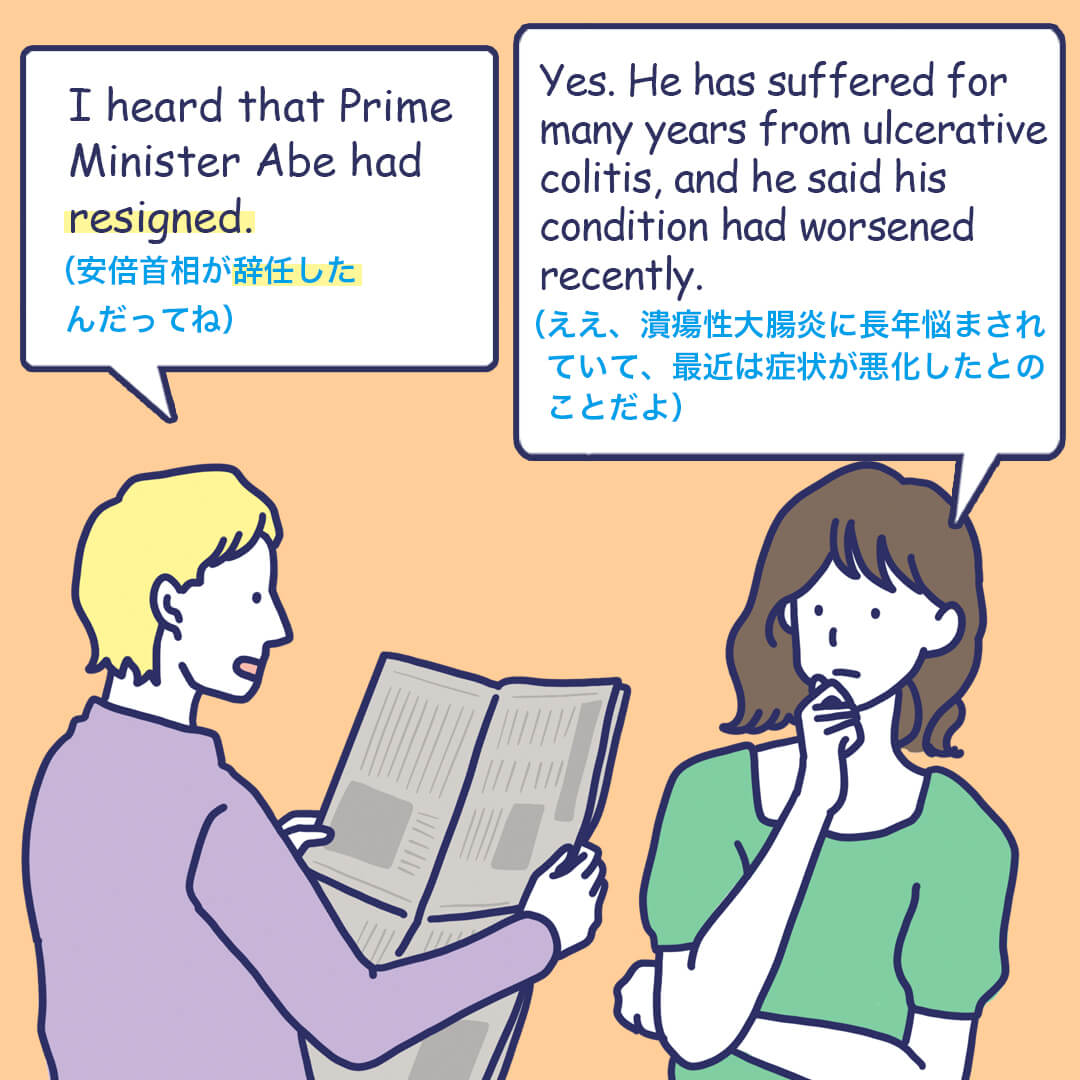 「辞任」はresignの他にstep downとも言います。総理大臣という台から「降りる」というのがイメージしやすい言い回しですね。