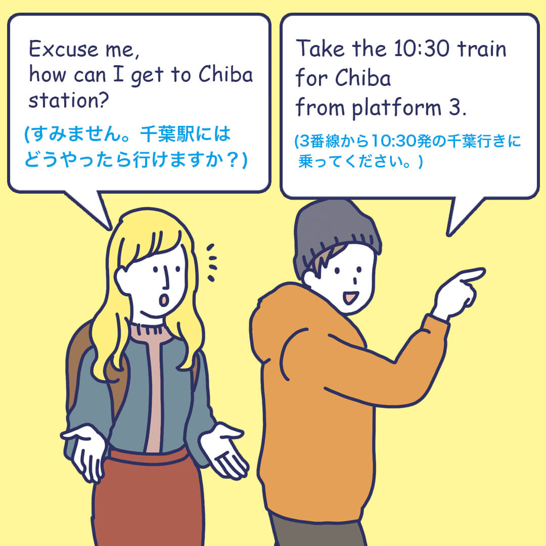 「3番線から10:30発の千葉行きに乗ってください。」英語でなんて言う?