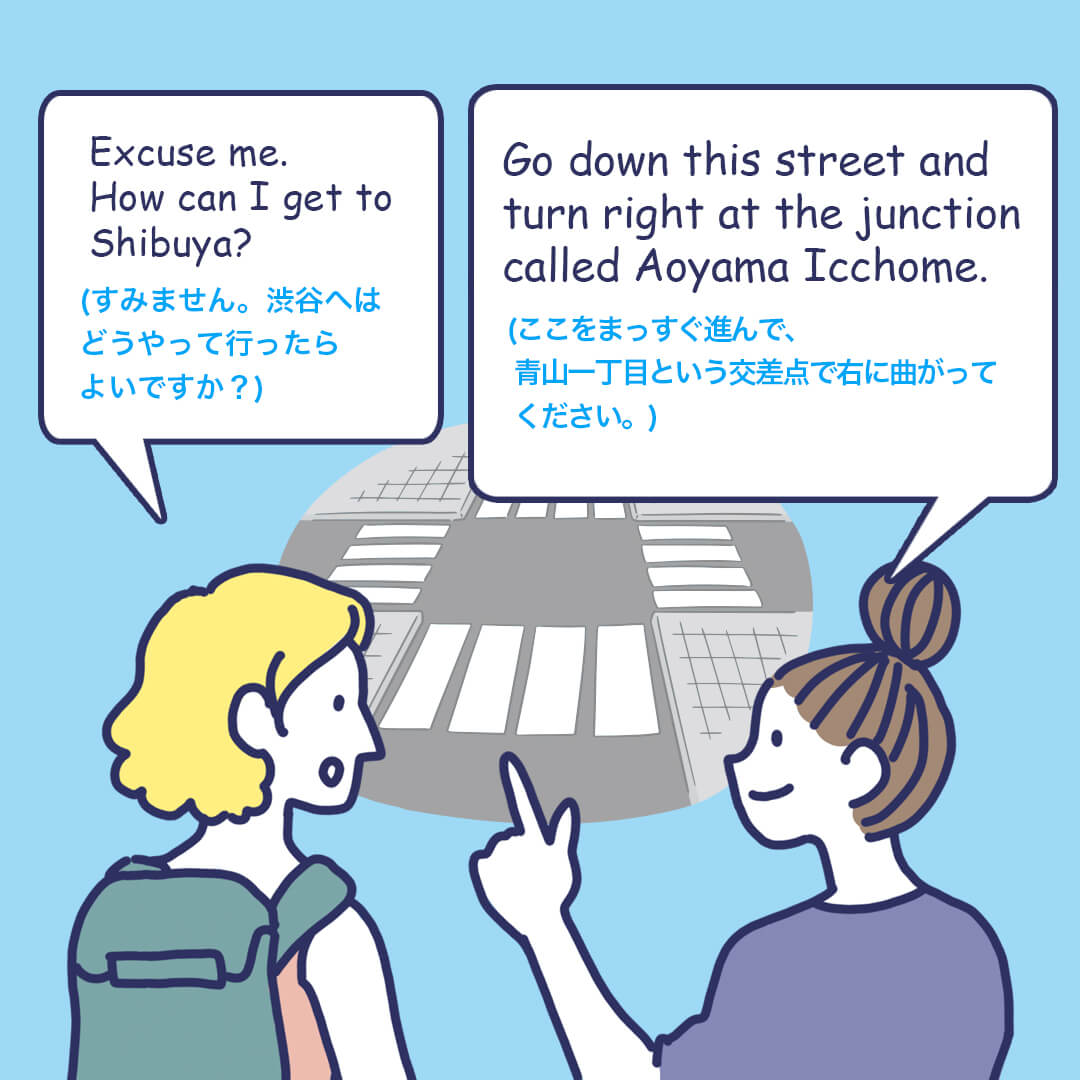 突然の道案内。「青山一丁目という交差点で右に曲がって下さい」って英語でなんて言う?