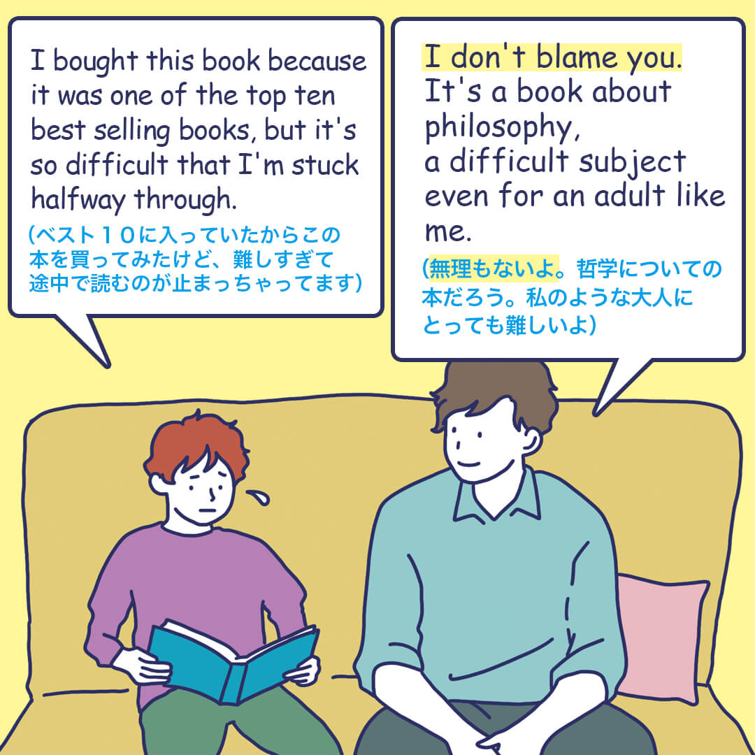 I don’t blame you.は直訳すると「私はあなたのことを責めません」です。例文ではyouでしたが、ここは場合によって変わります。