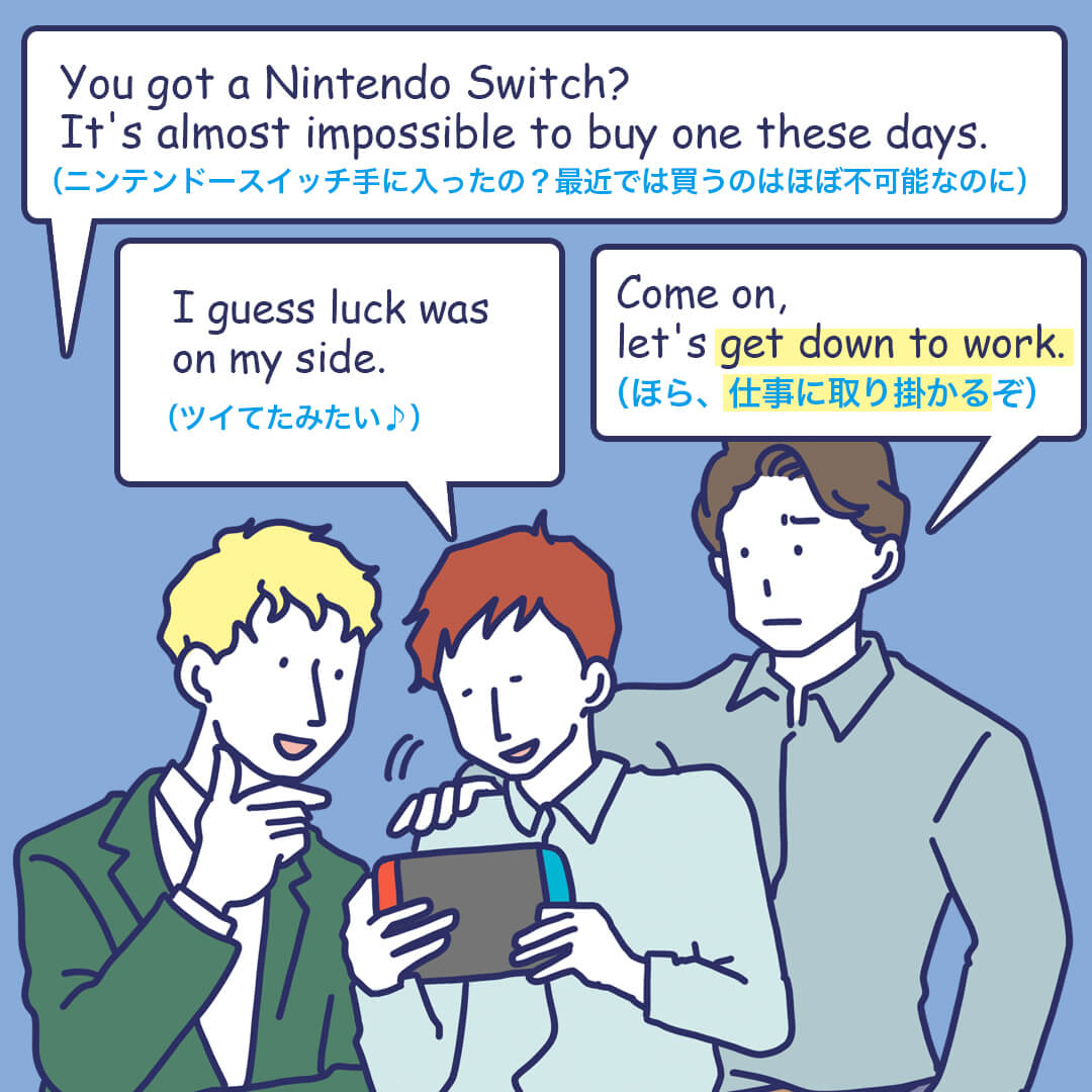 「仕事に取り掛かる」はget to work、get down to workなどと言います。
