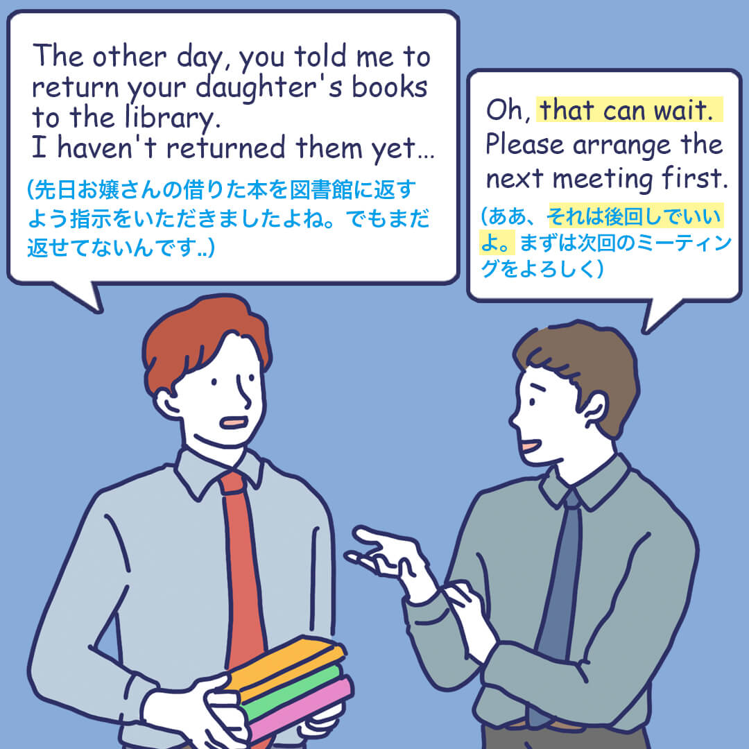 That can wait.直訳すると「それ(本の返却)は待てる」というとても英語らしい表現です。