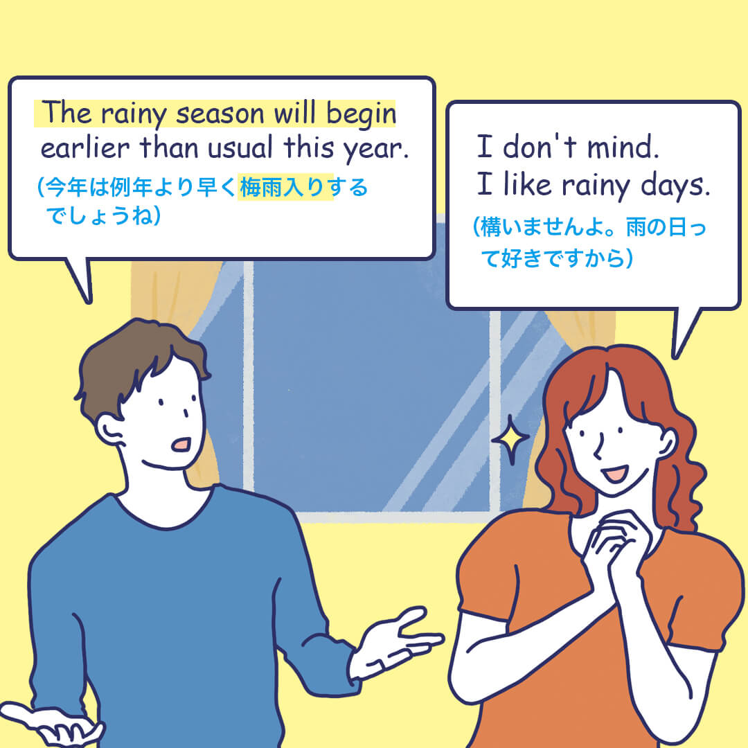 The rainy season begins.と言ってもいいですし、beginの代わりにset inを用いたりもします。
