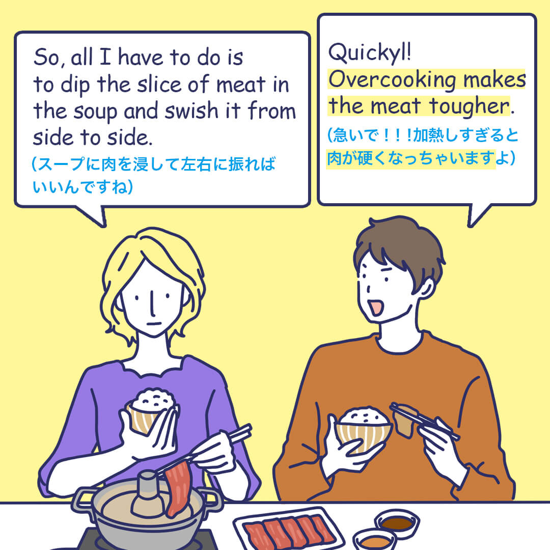 「加熱しすぎると肉が硬くなる」英語でなんて言う?