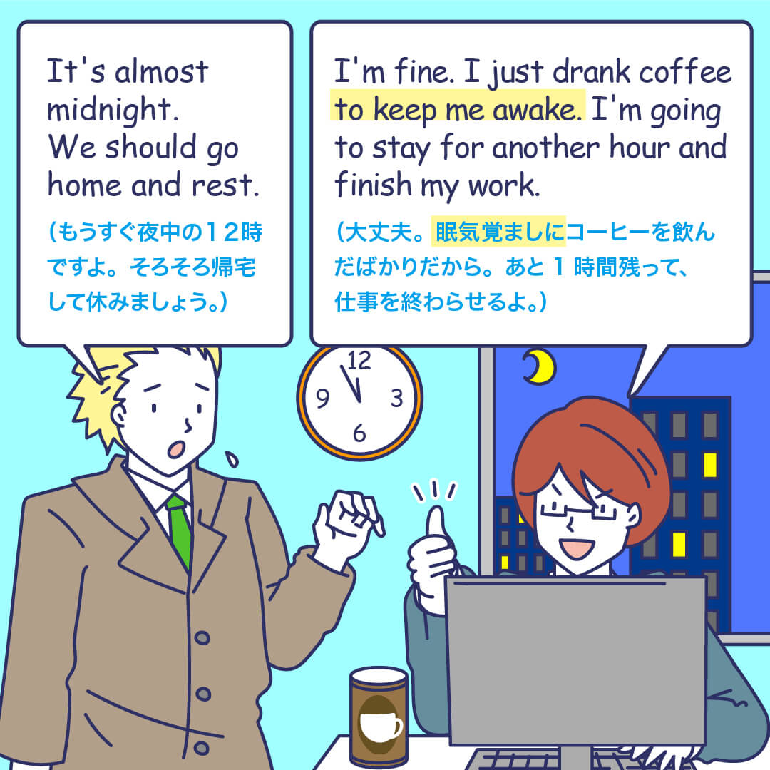 to keep me awake の代わりにto stay awakeなどといってもOKです。