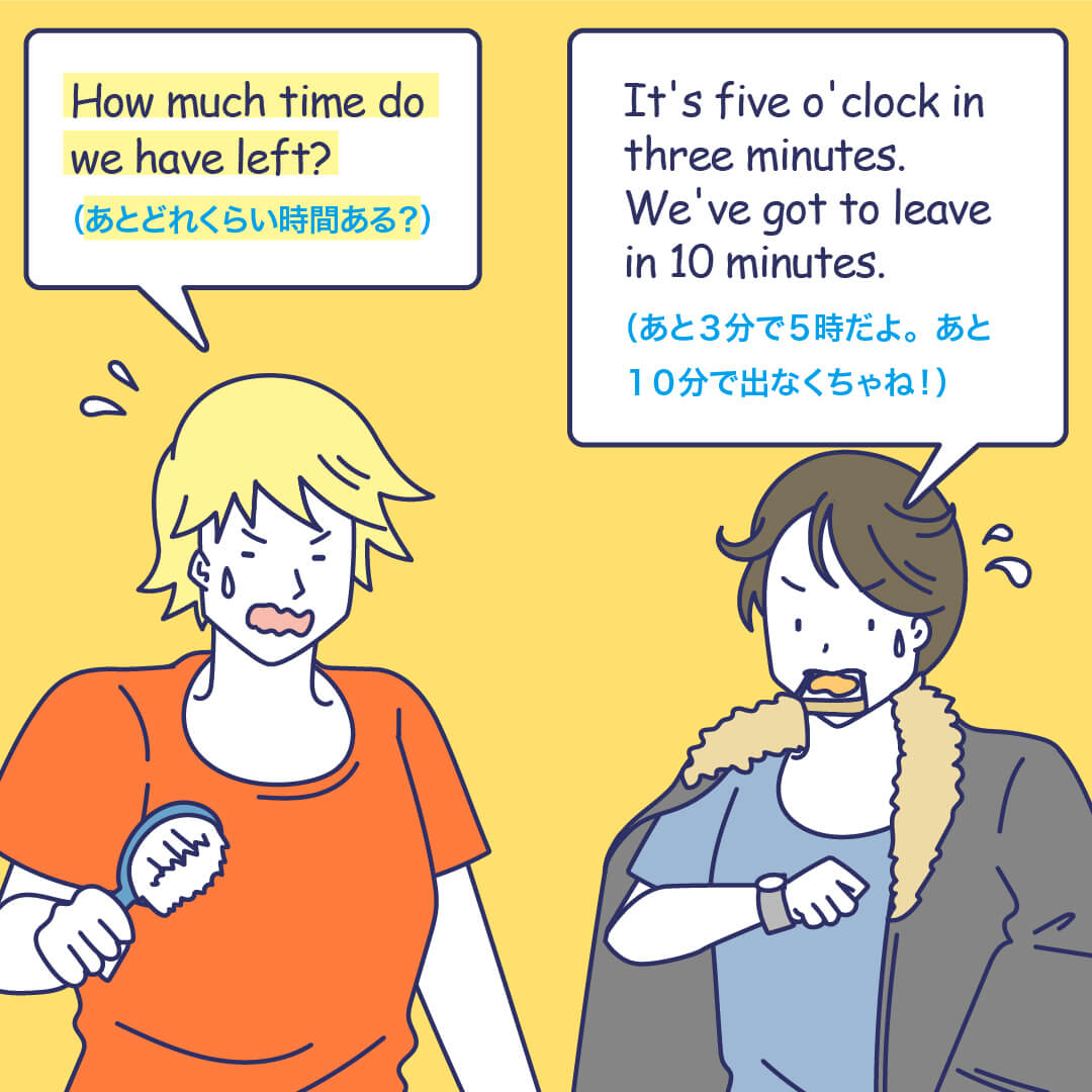 timeは数えられない名詞なので、How much〜から質問を始めます。minutesは数えられるので、
