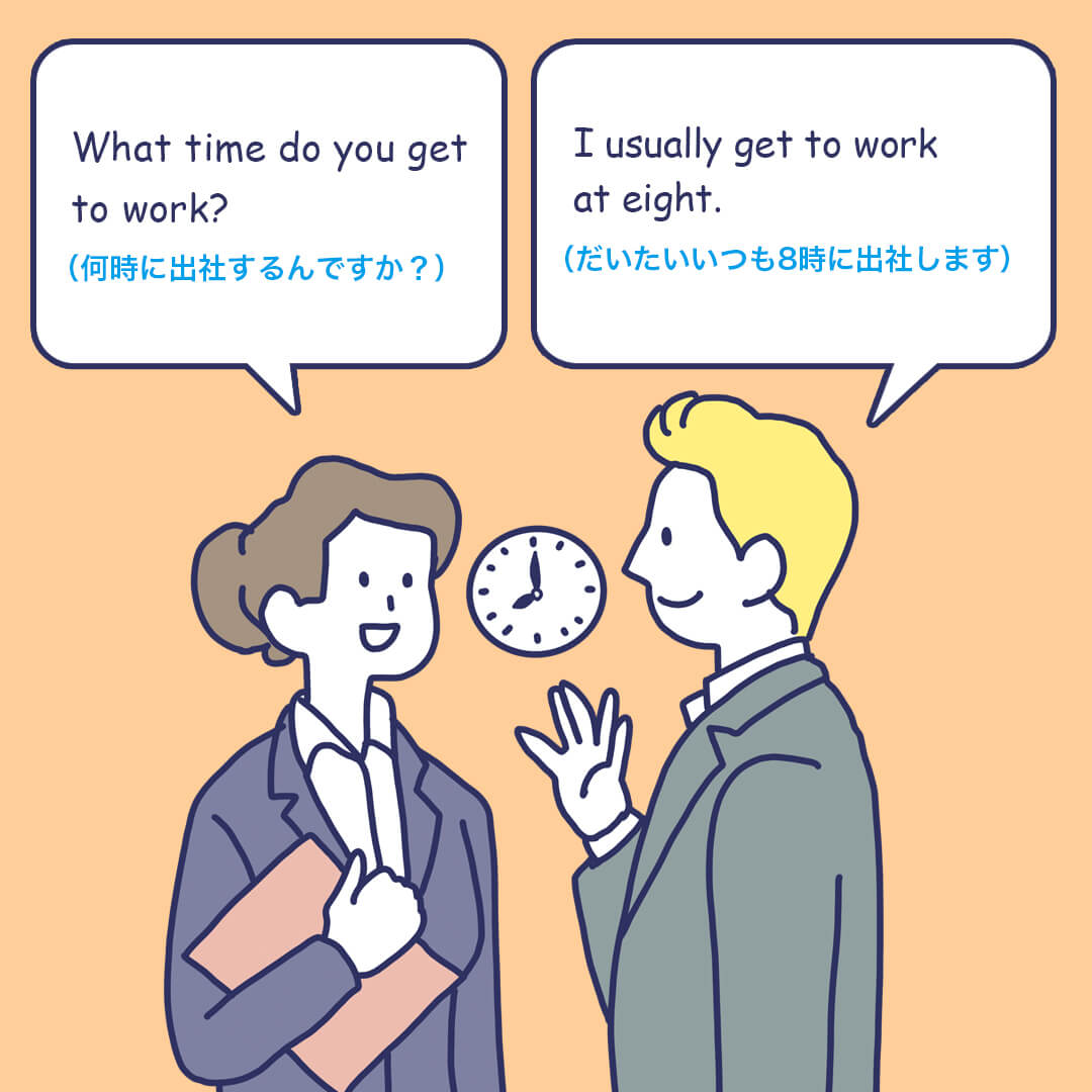 get to~~で(~に着く)という意味です。What time do you get to the office?