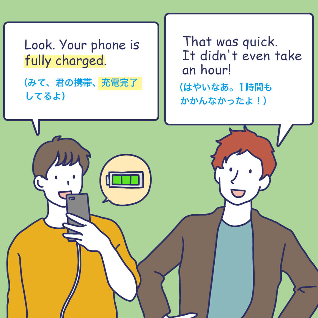 fully chargedで「充電がフルである状態」を指します。half chargedで「充電が半分である状態」になります。