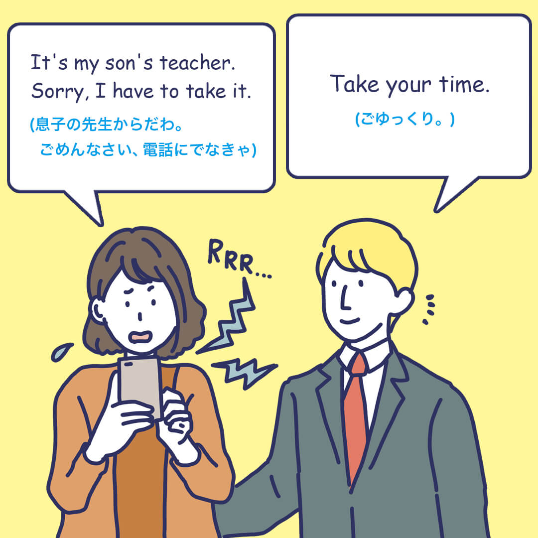 ’Take your time.’は「焦らないで」「ごゆっくり」と言いたい時に使います。