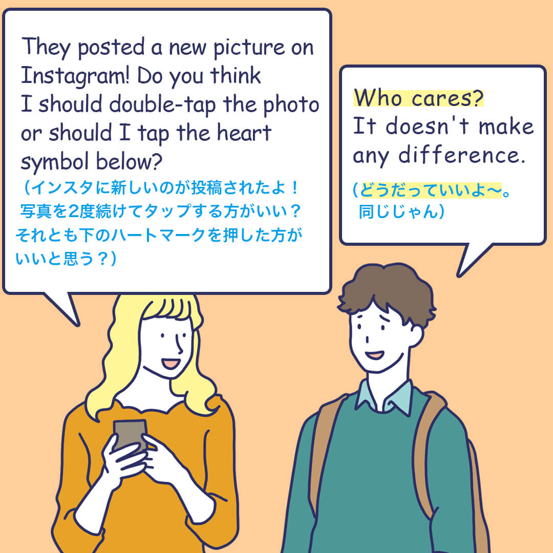 今回のcareは「気にする」という意味で使っています。Who cares?を直訳すると
