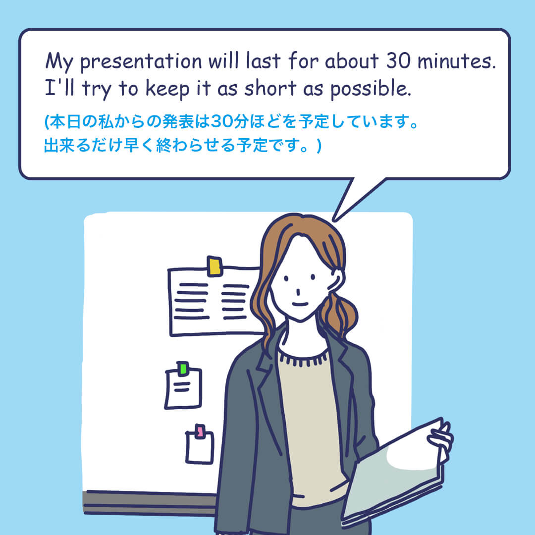 英語でプレゼン!「本日の私からの発表は30分ほどを予定しています。」英語でなんていう?