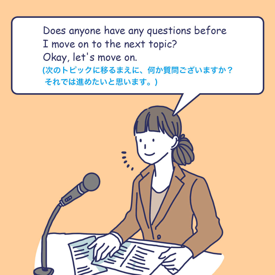 英語でプレゼン!「次のトピックに移るまえに、何か質問ございますか?」英語でなんていう?