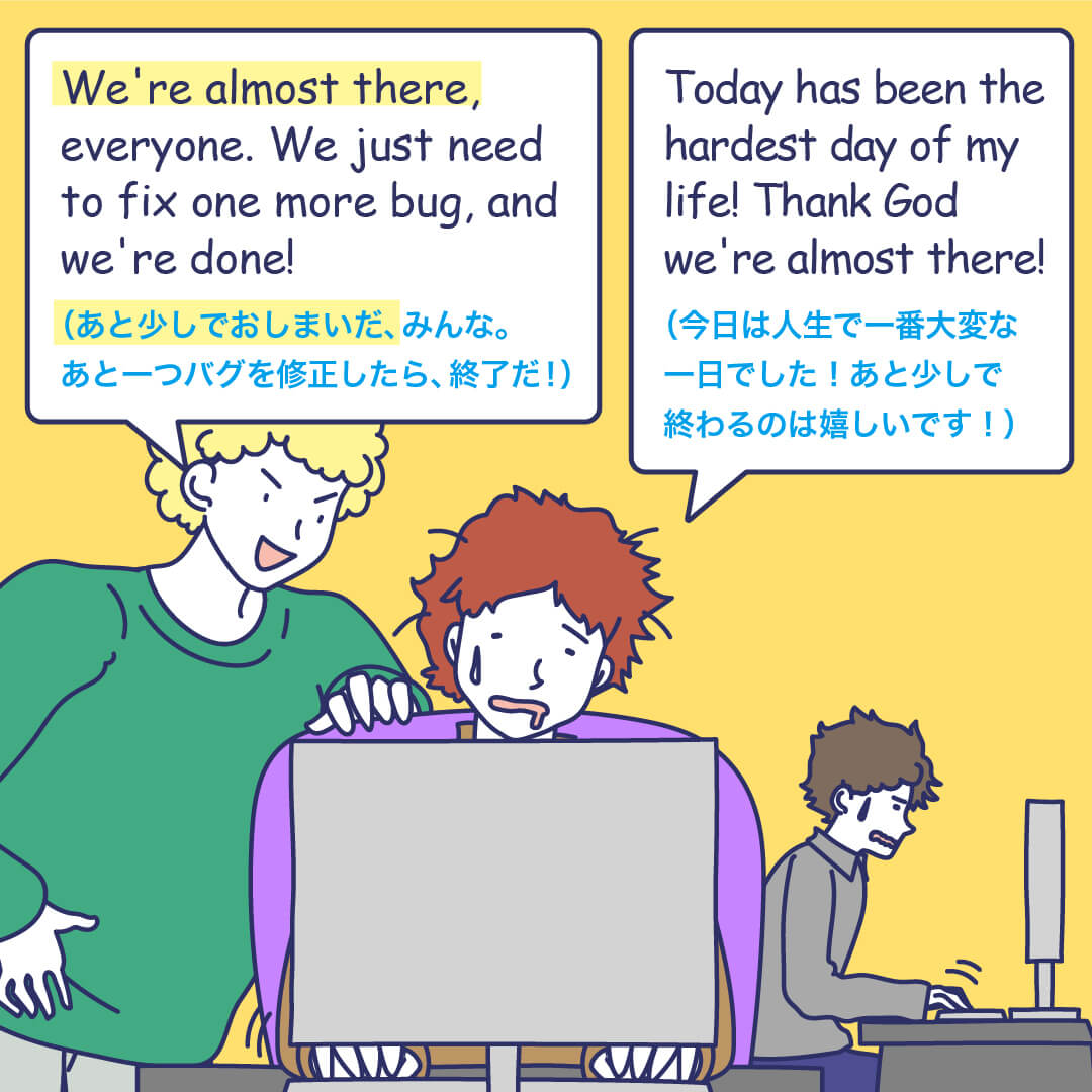 We’re almost there.で「もうすぐ終わる」という意味です。文字通り、「もうすぐ着くよ」という意味でもよく使います。