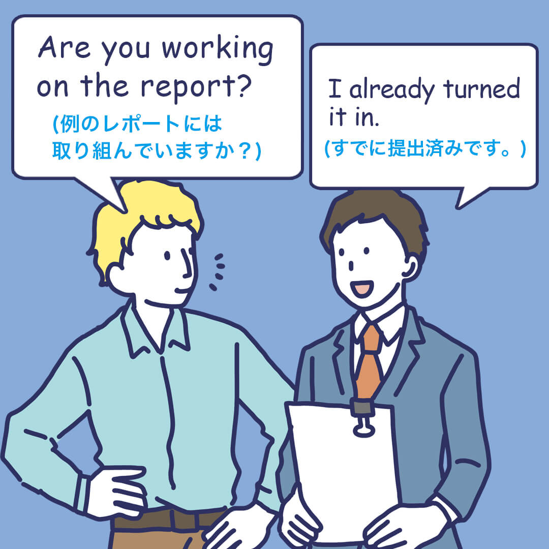 手渡しで提出する場合は’hand in’というフレーズを用いることもあります。