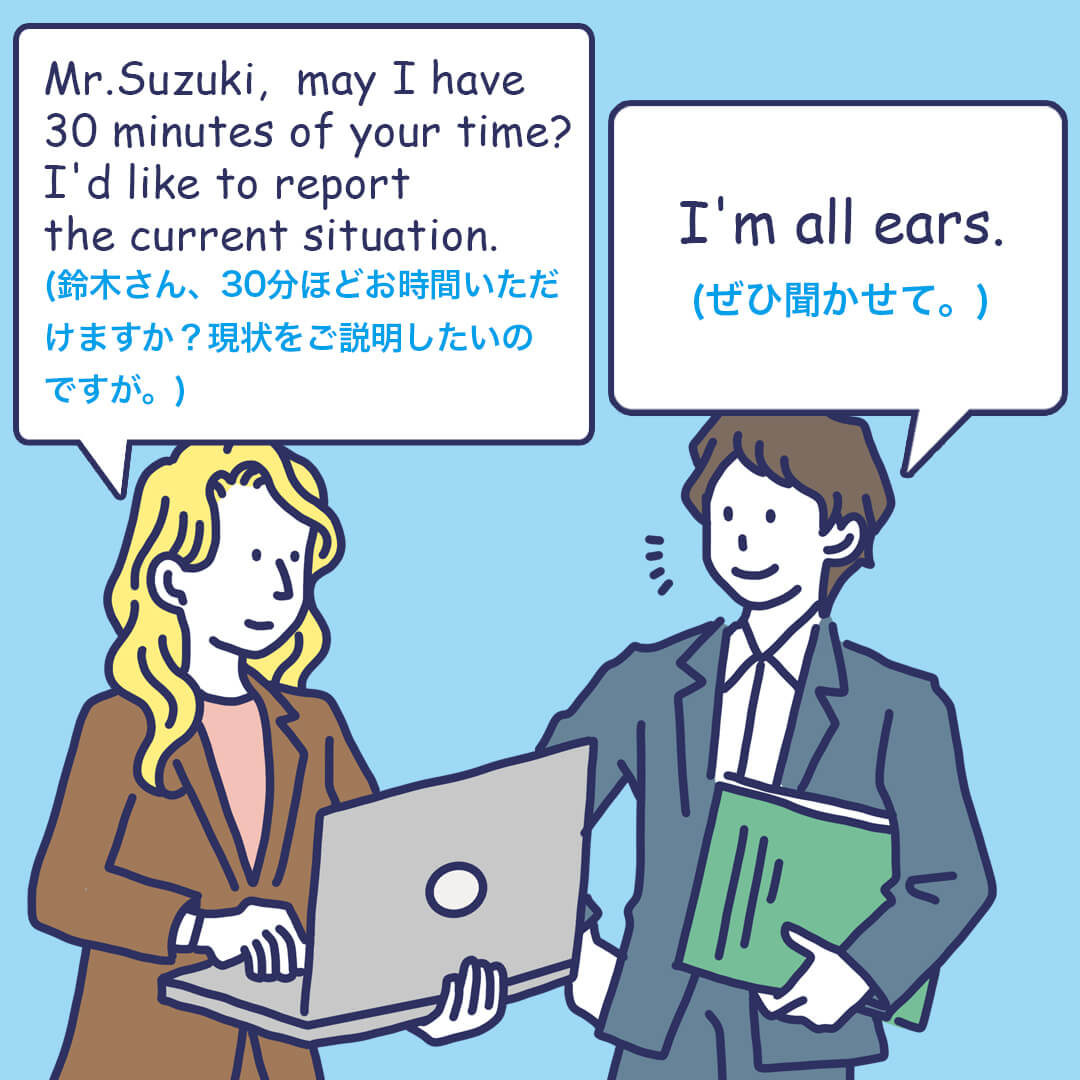 I’m all ears.は「聞いてるよ。」「聞かせて。」