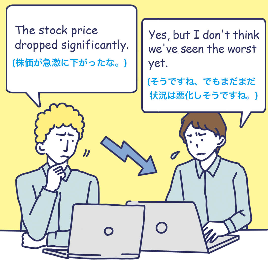「まだまだ状況は悪化しそうだ。」色々な言い方がありますが、例文の言い方は英語らしい表現でぜひ使っていただきたいです。