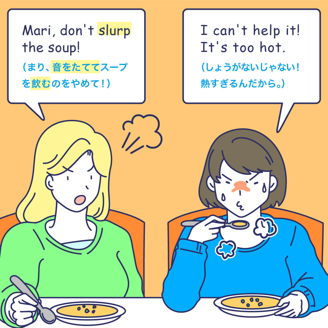 「音をたててスープを飲む」は英語だとslurpという動詞一言で表すことができます。