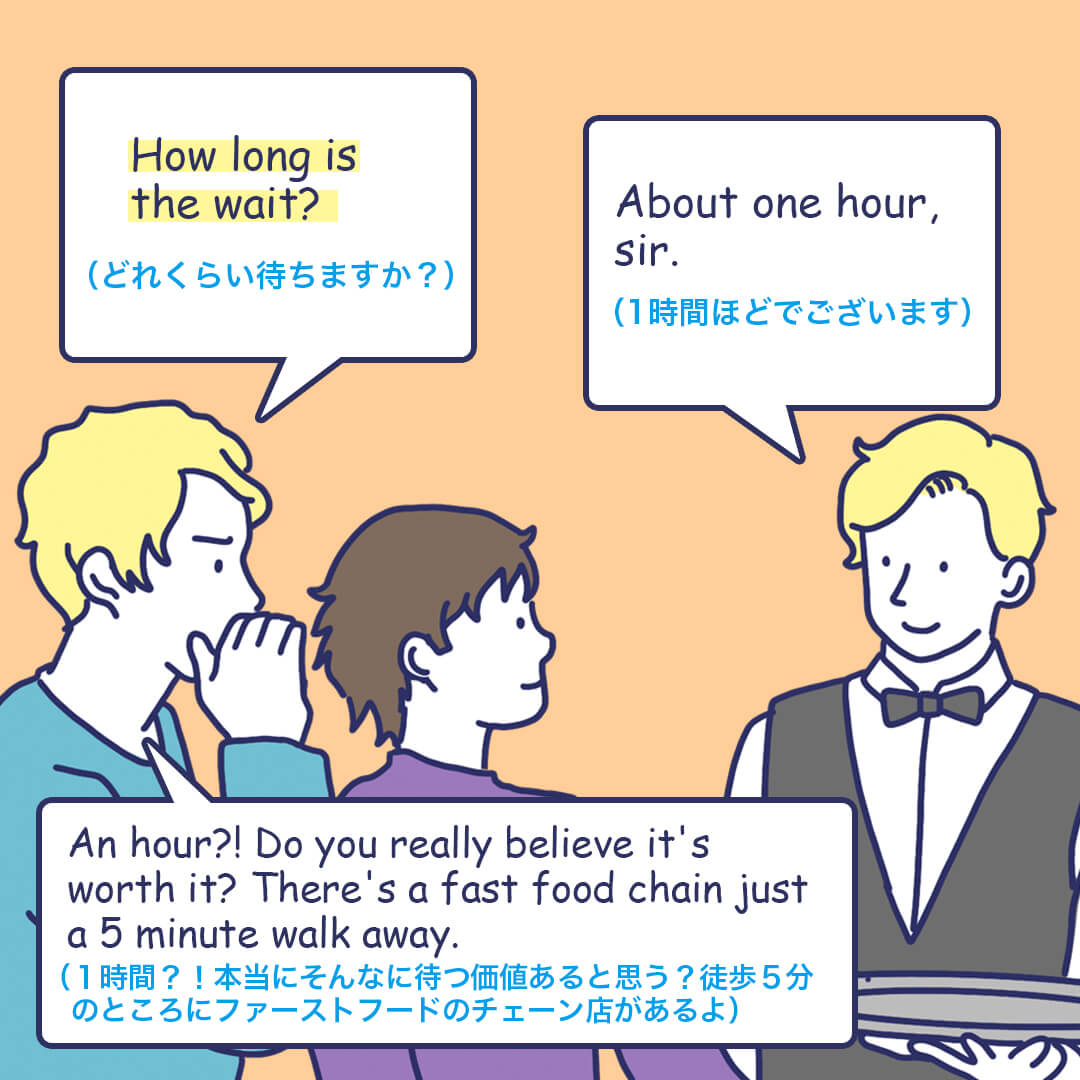 他にも、シンプルにHow long do we need to wait?などでもいいですね!
