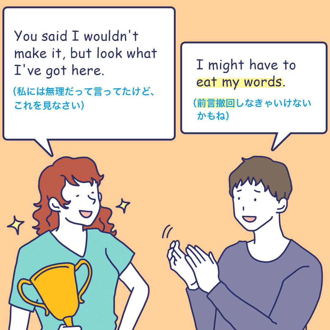 “”I’ll make you eat my words!””で悔しいことを言われた時に「今の発言、絶対に後悔させてやる!」という感じでも使えます。